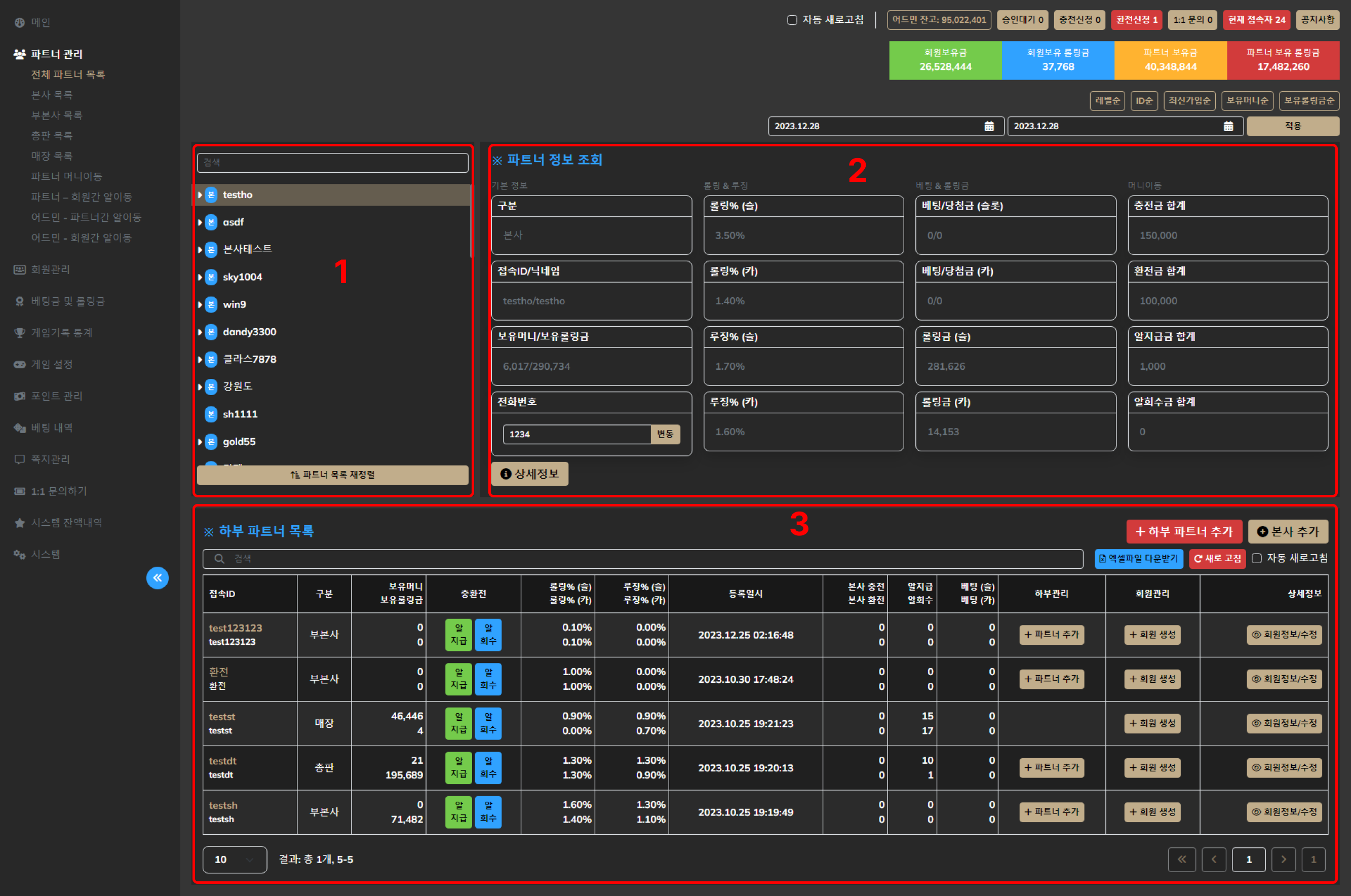 하부파트너 테이블은 파트너 나무에서 선택한 파트너에 속한 하부들의 목록을 제공합니다. 롤링요율, 루징요율, 총입금/출금, 알지급/알회수 등과 같은 중요 정보가 쉽게 확인할 수 있습니다.