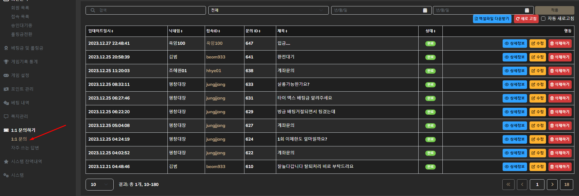 * **편집**: 문의 상태를 변경하여 해결 진행 상황을 업데이트합니다.&#x20;