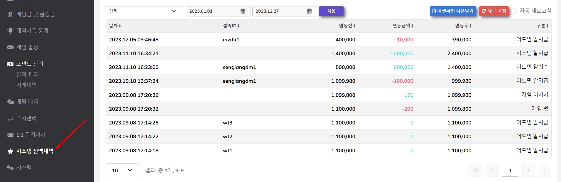 컴파니 잔액내역을 확인하려면 '시스템 잔액내역'으로 이동하면 됩니다.